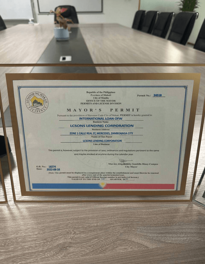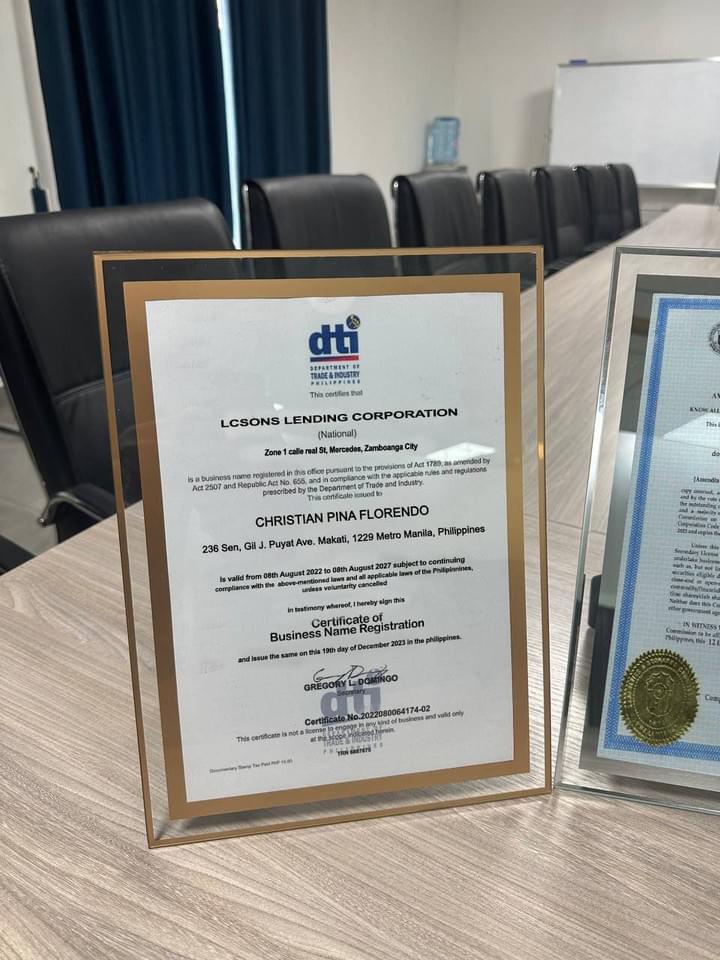 LCSONS LENDING CORPORATION, the Department of Trade and Ind ustry (DTI), ensuring our operations comply with all local business regulations and standards.